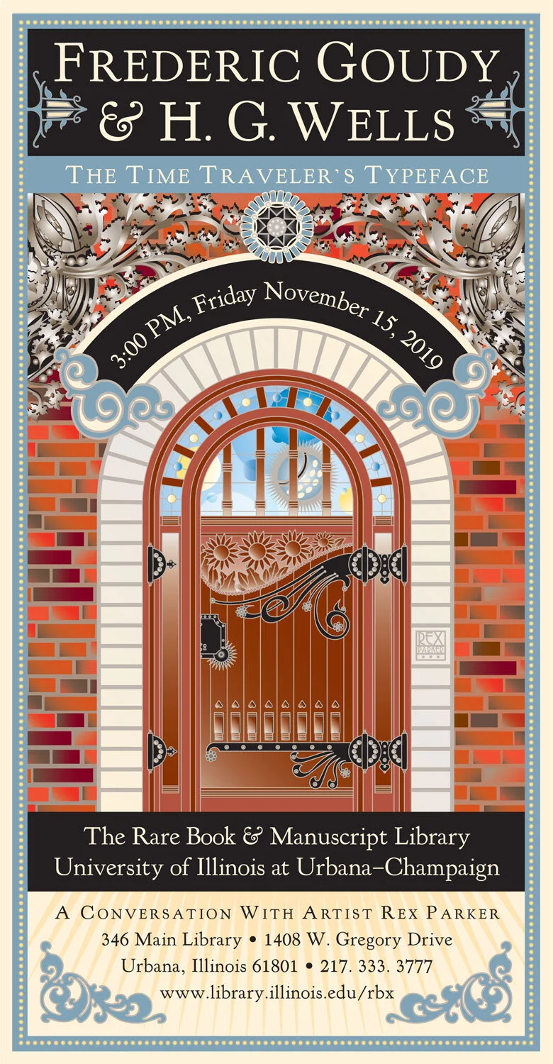 Park Ridge artist Rex Parker will present an original, illustrated program, “Frederic Goudy & H. G. Wells: The Time Traveler’s Typeface.” It explores a book publishing dream team: Frederic Goudy, “the titan of type” and H. G. Wells, the “time-traveler novelist,” and their remarkable collaboration on The Door in the Wall — a collection of thrilling short stories and the creation of a timeless typeface Kennerley Old Style.